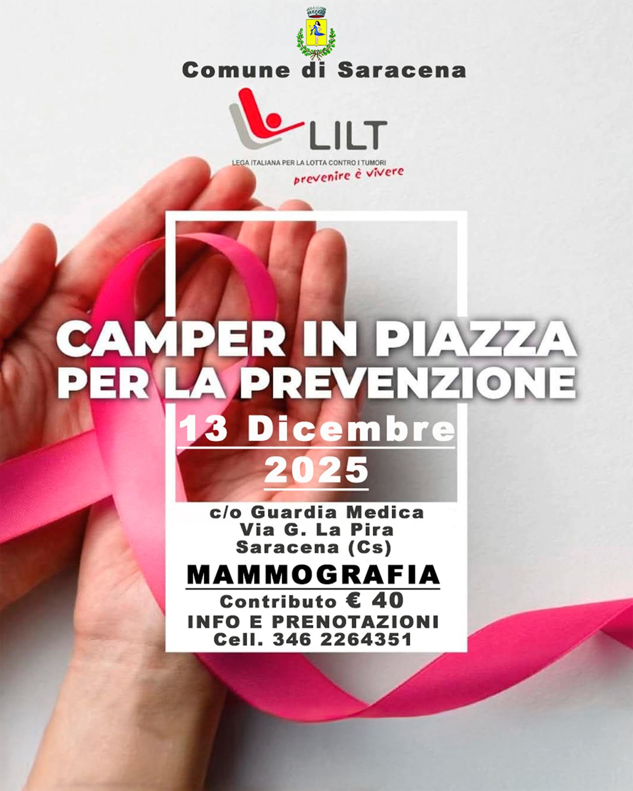 L’Amministrazione Comunale, in collaborazione con la Lega Italiana per la lotta contro i Tumori - Associazione Provinciale di Cosenza, organizza una giornata dedicata alla prevenzione del tumore al seno.